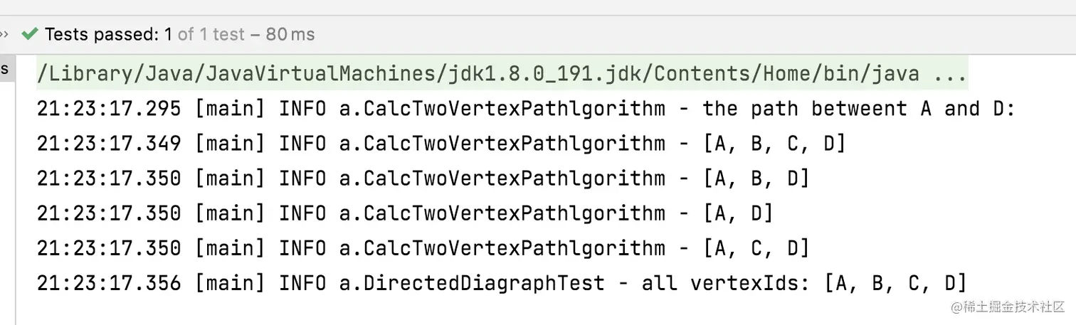 allPathList中存放了所有可达的路径列表。 printAllPaths()方法打印所有的路径。getAllVertexs()返回所有可达的顶点集合。