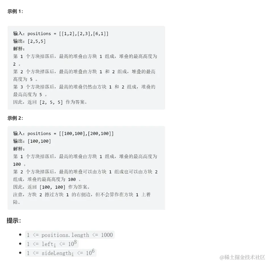 随机抽了个题,题目意思并不复杂,就是不断有方块掉落,后面掉的方块会压在前面掉的方块上面,要求返回每次落完方块后的最大高度。