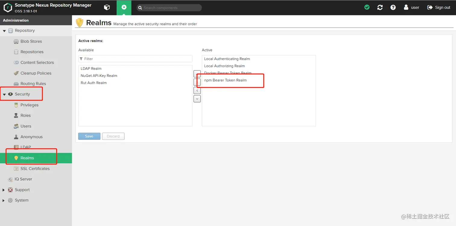 解决:将包发布到nexus npm仓库需要设置一下 Nexus Repository Manager 的权限。否则无法登陆到我们的私服。在Security->Realms栏目里,将npm Bearer Token Realm 选入Active。