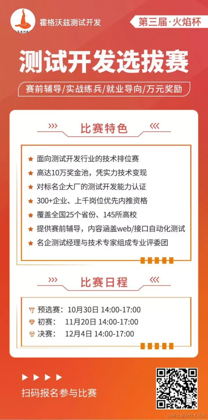 欢迎报名参加第三届火焰杯软件测试开发选拔赛- 高校赛道,预选赛在10月30日(本周日)14:00正式开始!本次预选赛开设多个奖项涉及数万元奖励