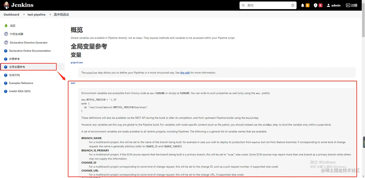 注意事项: get_env_from_jenkins方法为从Jenkins获取全局变量,查看全局变量的路径为:Jenkins流水线语法-全局变量-env,见下图:
