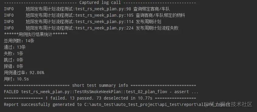 - 将获取到的各个(通过、失败、跳过、报错)执行结果与用例通过率一起,输出到控制台展示:↓(Windows本地运行效果)