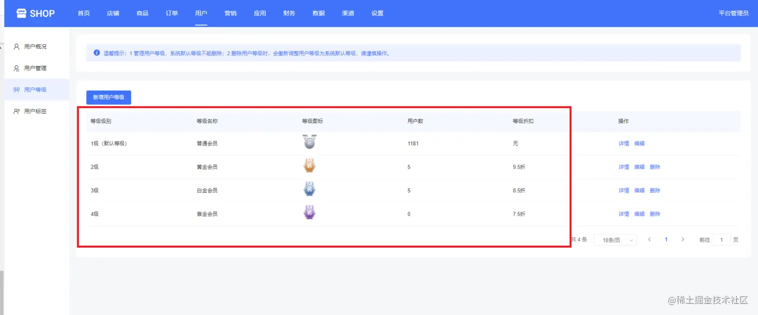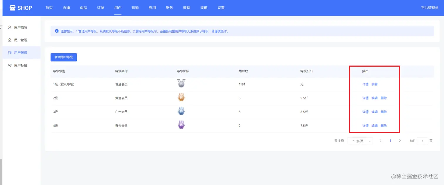 平台管理可以对等级进行详情、编辑、删除等操作,但是删除用户等级时,关联该等级的用户将迁移至系统默认等级(1级),系统默认的用户等级不能删除,不能设置等级条件、不能改变等级级别,如下图所示: