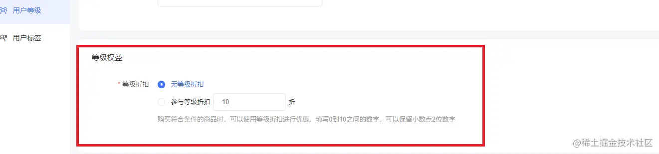 用户升级后不支持降级,需要手动调整用户等级,使用会员折扣的功能,除了需要在用户等级设置折扣;还需要在后台—营销—会员折扣选择需要的商品参与会员价。