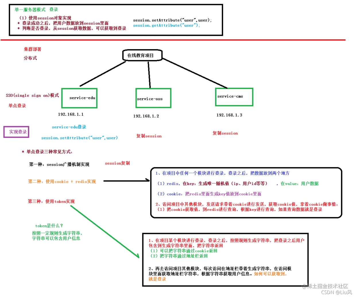 sso需要一个独立的认证中心,所有子系统都通过认证中心的登录入口进行登录,登录时带上自己的地址,子系统只接受认证中心的授权,授权通过令牌(token)实现,sso认证中心验证用户的用户名密码正确,创建全局会话和token,token作为参数发送给各个子系统,子系统拿到token,即得到了授权,可以借此创建局部会话,局部会话登录方式与单系统的登录方式相同。