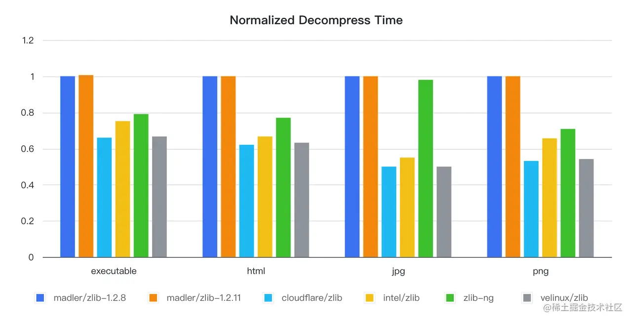 在内部业务的性能分析优化过程中,我们通过性能分析采集工具发现, zlib 压缩和解压缩函数(deflate/inflate)的热点,在内部某业务线的的 CPU 占比超 50% 以上。由此可见,业务部署的 madler/zlib 1.2.8 开源版本在性能上仍有提升空间。在调研过 intel/zlib、cloudflare/zlib、zlib-ng 等多个 zlib 版本后,最终在开源 madler/zlib 1.2.11 的基础上,集成了多个优化补丁: