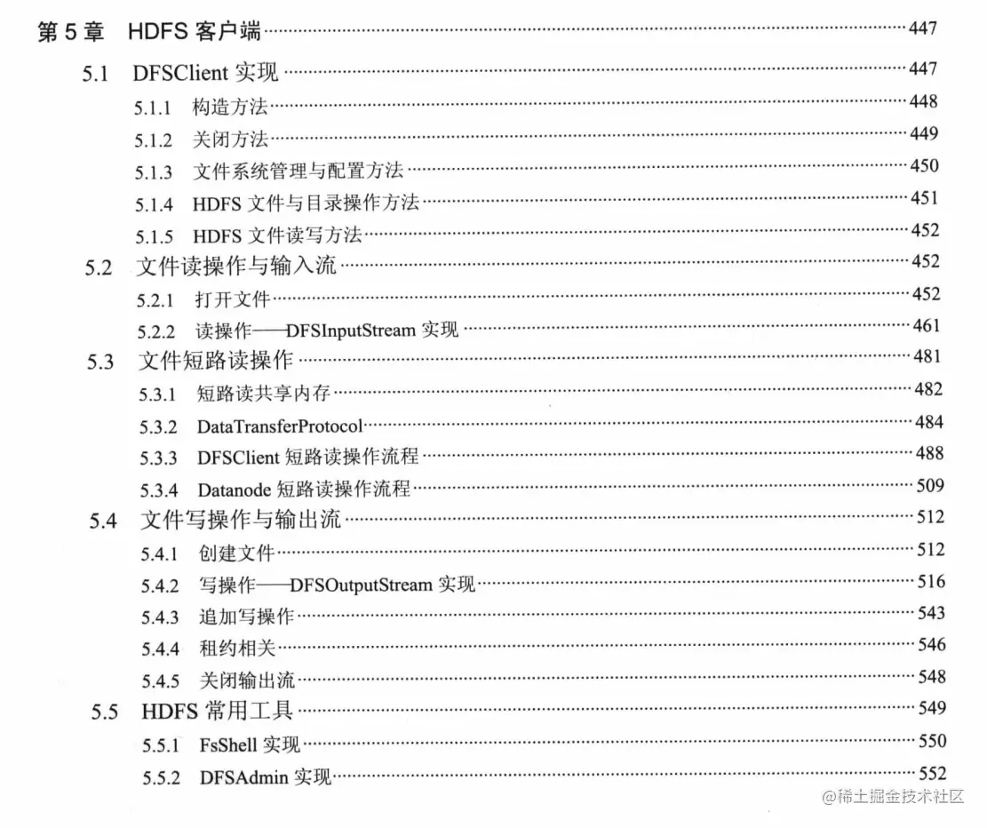 DistributedFileSystem、FsShell 以及DFSAdmin都是通过直接或者间接地持有DFSClient对象的引用,然后调用DFSClient提供的接口方法对HDFS进行管理和操作的。DFSClient类封装了HDFS复杂的交互逻辑,对外提供了简单的接口,所以本章以DFSClient类作为入口来研究和学习HDFS客户端的逻辑以及源码实现。
