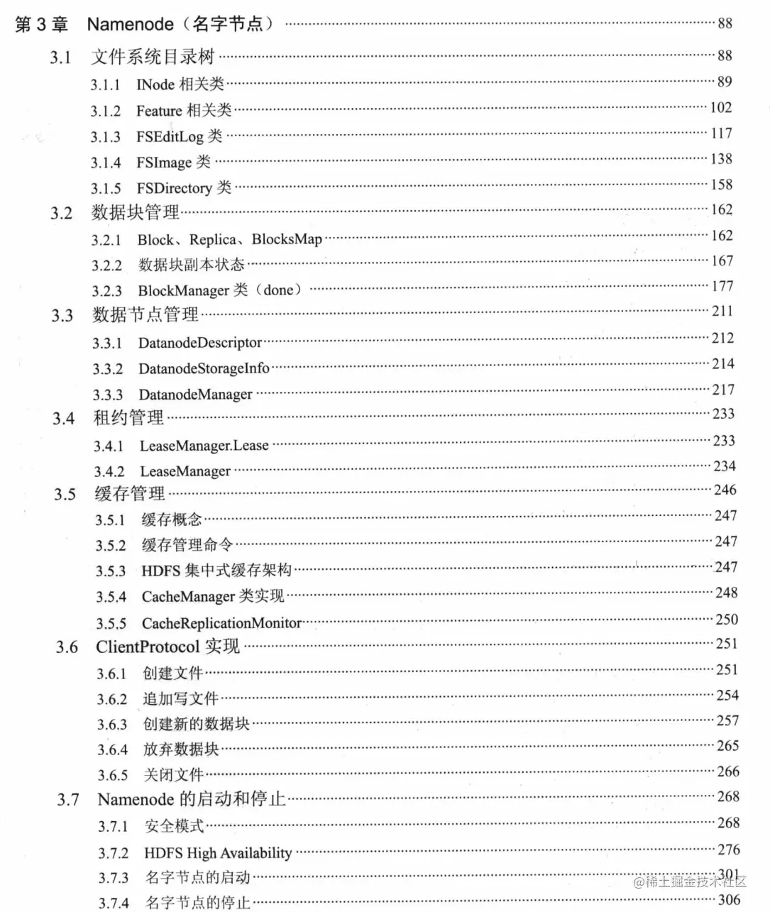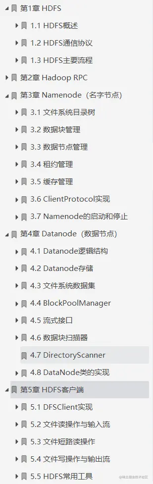 第3~5章分别介绍了Namenode、 Datanode 以及HDFS客户端这三个组件的实现细节,同时穿插介绍了HDFS 2.X的新特性,例如Namenode HA就放在Namenode章介绍,而Federation Namenode新特性对Datanode的修改比较多,所以就放在Datanode章介绍。