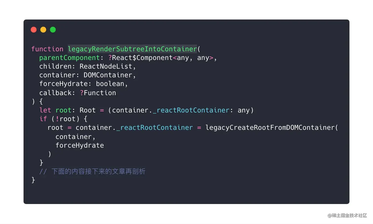 这部分代码其实没啥好说的,唯一需要注意的是在调用 legacyRenderSubtreeIntoContainer 函数时写死了第四个参数 forceHydrate 为 false。这个参数为 true 时表明了是服务端渲染,因为我们分析的是客户端渲染,因此后面有关这部分的内容也不会再展开。
