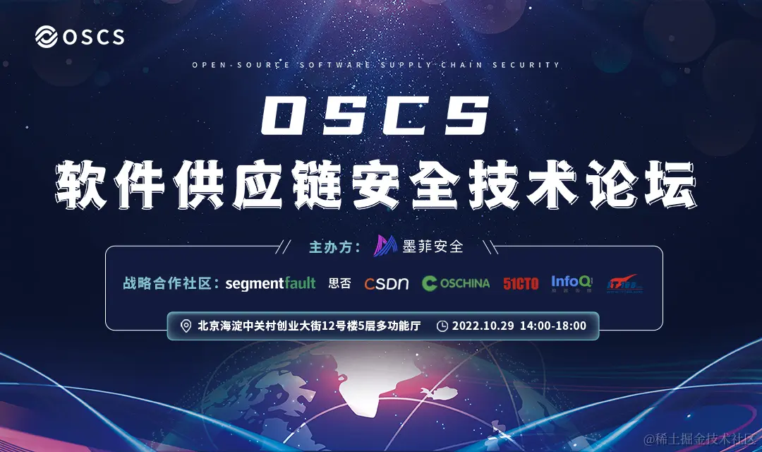 OSCS 软件供应链安全技术论坛是 OSCS 社区针对软件供应链安全主题开展的首场专业性技术论坛,首期论坛由 OSCS 社区创始成员墨菲安全发起,将于 10 月 29 日 在海淀中关村创业大街举办。