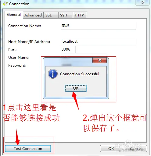 3.点击navicate左上角:连接->MySQL->先测链接下,如果提示连接成功,就可以填写连接名,点击连接即可。
