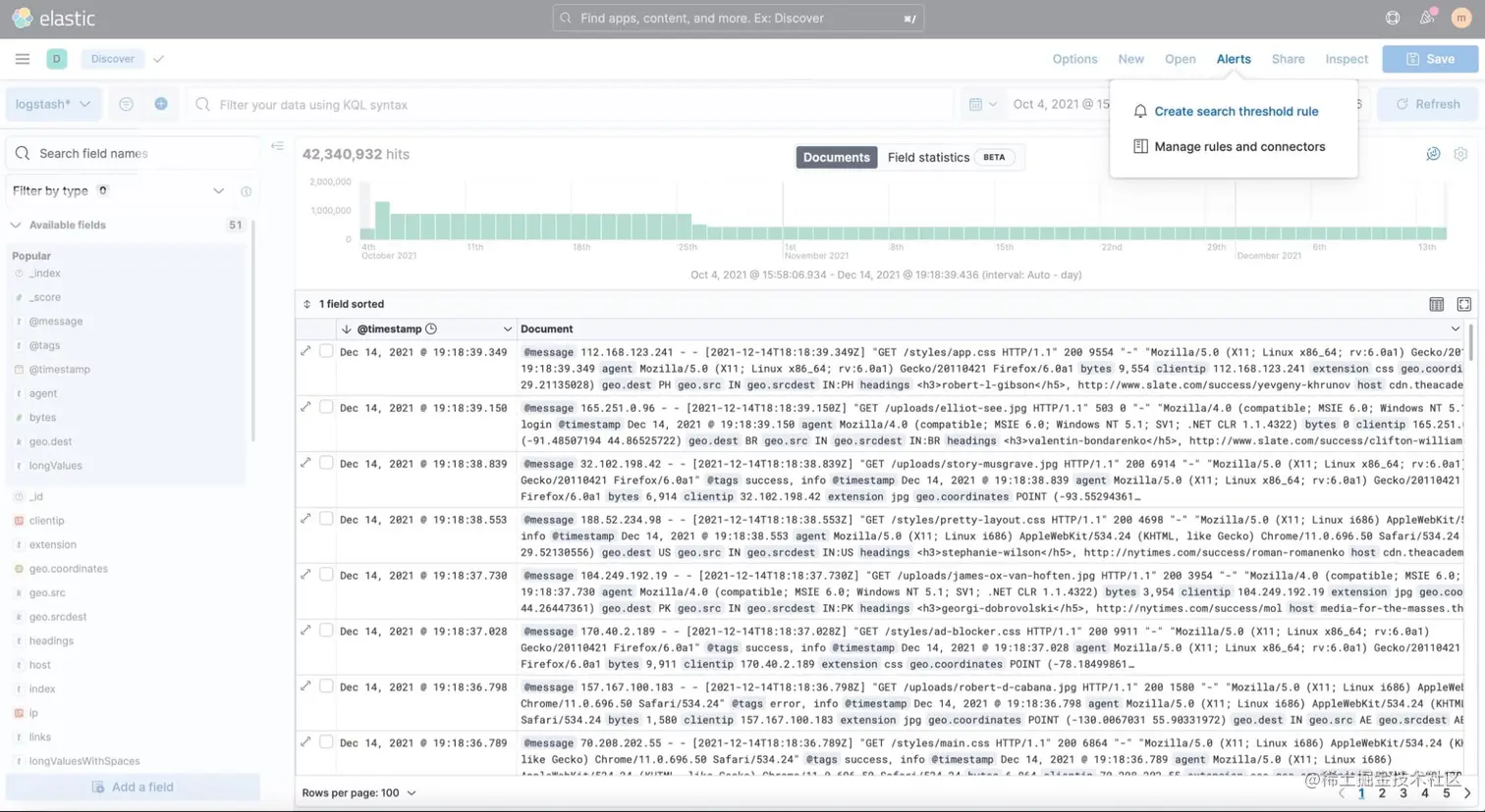 现在在 8.x 中,我们一直在不断地添加重大更改。 我们最近引入了一个新的增强文档表、字段统计信息以及创建搜索阈值警报的功能。 下面的屏幕截图显示了最近添加或更改的内容: