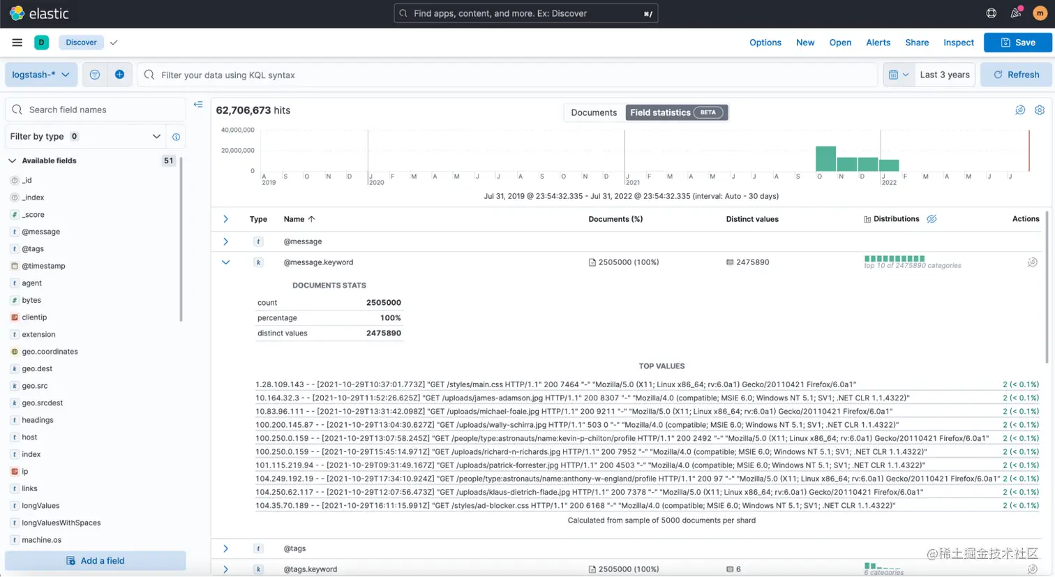 Kibana 的机器学习提供数据可视化器(Data visualizer)已有一段时间了。 在 8.1 中,它被添加到 Discover 标记的 Field statistics 信息中。 它提供了一种方便的方法来更深入地了解 Elasticsearch 中的数据结构。 想要快速了解一个字段的最高值、它的基数、包含它的文档的百分比以及它的分布? 现在只需单在 Discover 点击即可。