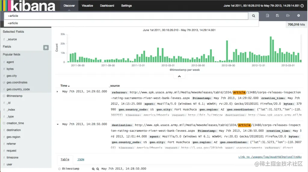 Discover 已经存在了很长一段时间。 尽管如此,它仍然是 Kibana 最常用的部分之一,允许你搜索和查看 Elasticsearch 的索引文档。 2015 年,它作为 Kibana 4 的一部分发布。让我们来看看数据发现的早期阶段:
