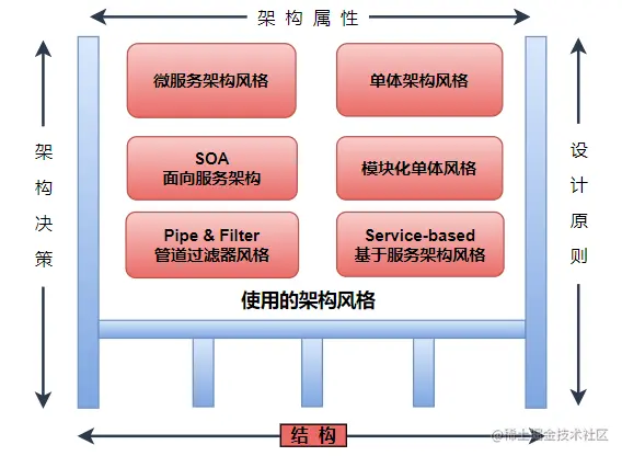 •结构:应用系统所选择的架构风格,比如微服务架构、单体架构还是SOA等