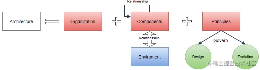 以上的定义从高层抽象视角对什么是架构给予了自己的回答,相比之下,Neil Ford 从架构组成元素入手,从更偏向实践的角度对架构进行了阐述。核心思想是软件系统的架构包括以下组合元素: