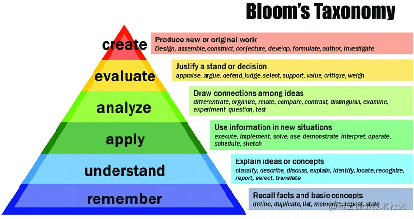 虽然开发人员和架构师在知识域的关注点上存在差异,但在认知层面都可以统一到Bloom认知层次模型。该模型将认知层次划分为逐步递进的六个层次: