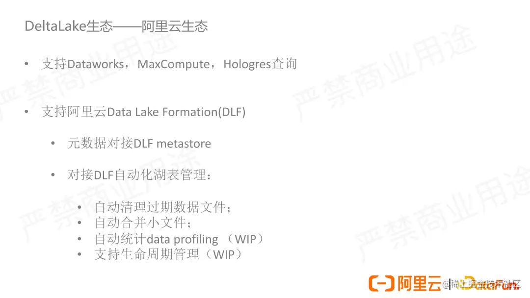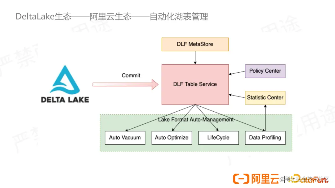 接下来我们来介绍一下阿里云生态对 Delta Lake 的支持。我们目前已经实现了 Dataworks,MaxCompute,Hologres 对 Delta 表的查询;对接并支持使用阿里云数据湖构建 DLF 作为元数据,助力实现更好的湖仓一体。同时我们也对接了 DLF 的湖表自动管理模块,这点我们展开介绍一下。