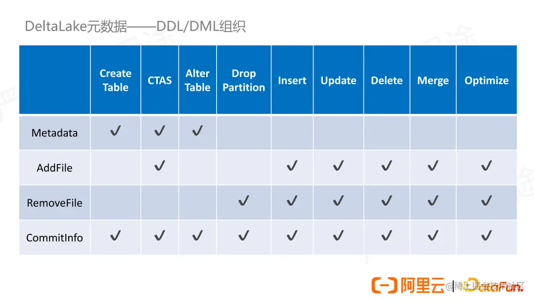 - CTAS(Create Table As Select) 。在创建表的同时会加载数据,所以同时会有 Metadata 和 AddFile 的 Action。