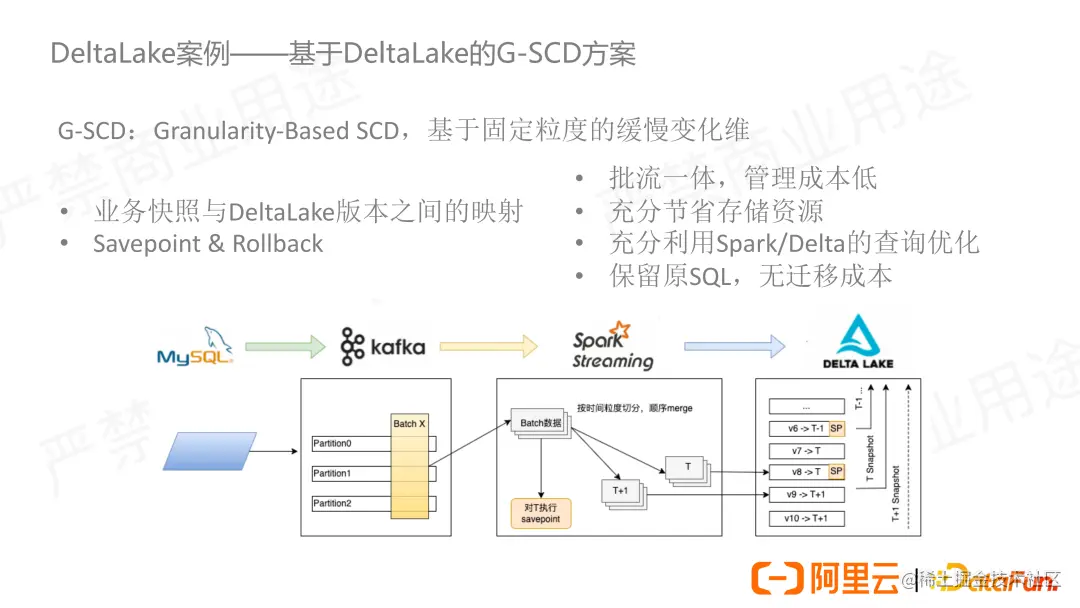 ② Savepoint&Rollback。对于传统方案来讲,只要不主动删除分区,分区是不会丢失的,而湖表则具备自动化清理历史版本的能力。G-SCD 方案下我们并不是需要保留所有的版本,而是希望能够指定某一个版本能够保留而不被删除,所以在这里我们需要 save point 的功能。另外的一点是数据难免是有错误的,我们也就需要版本回溯的功能,能够回溯到某一天的数据从而重新修补数据。这里 rollback 的功能相当于社区 2.0 版本发布的 restore 功能。