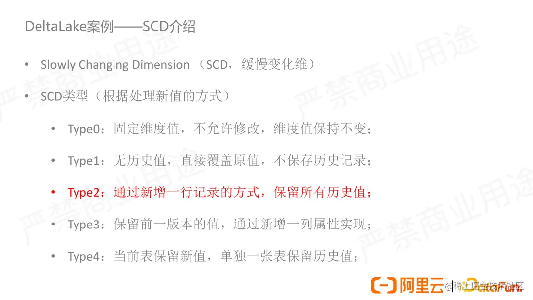 Slowly Changing Dimension(SCD,缓慢变化维),SCD 是用来解决在数仓场景中随着时间缓慢变化的维度数据的。根据对变化之后的新值的处理方式,定义了不同的 SCD 类型,这里我们着重讨论一下 Type2:通过新增一行记录的方式来保存历史值的这种类型。通常情况下我们在传统数据库内我们首先会在表中添加 Start 和 End 列来标识当前维度值的生效范围,如果 End 值为空表示当前维度在最新版本是生效的,我们也可以再添加一列状态列来表示当前维度值是否生效。更多的时候我们不会关注每一次变化,而只关心一个固定的业务周期或者一个时间段内最新的值是什么。举一个例子:我们将用户和其所在地做成的一个维度表,假设用户 A 从北京迁到杭州、武汉,在表中用户 A 不同时间就会有不同的地址。我们想知道 2022 年 7 月 16 号用户 A 的所在地,也就是它最终的所在地武汉,而不是关注用户 A 早上从北京到了杭州,中午又从杭州到迁了武汉的过程。