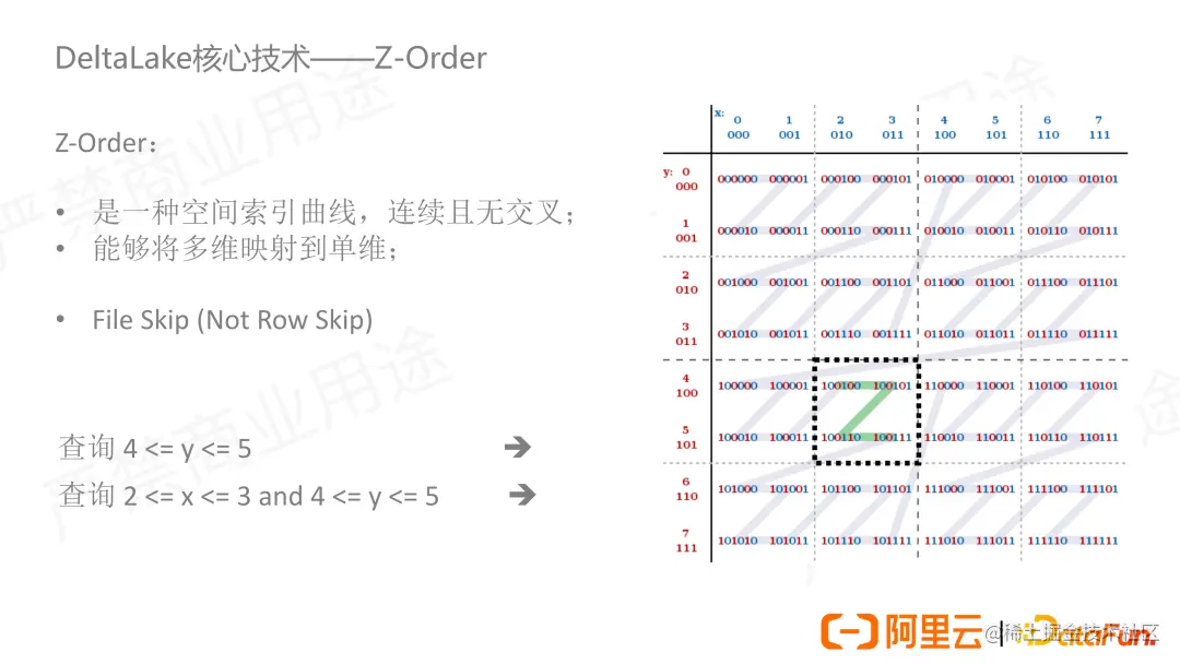 让我们再举一个例子,如果我们要查询 2<=X<=3 and 4<=Y<=5,如果按照 Z-Order 来排序的话就只要扫描一个文件,按照传统线性排序的方式需要扫描 2 个文件(X∈[2,3],Y∈[4,7])。可以看到在我们使用 Z-Order 之后需要扫描的数据量减少了一半,也就是说在同等计算资源的情况下我们的查询时间可以减少一半,使性能提升一倍。从以上例子我们可以看出线性排序更关注的是当前排序的字段的聚集效果而不是空间的聚集效果。