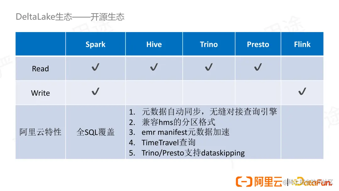 Delta Lake 本身就是 Databricks 公司开源的,所以它们对 Spark 的支持从底层代码实现到性能上的表现都比较好的,只不过对于开源版本来说某些 SQL 功能还没有完全开放或支持。阿里云 EMR 的 Delta Lake 版本目前已经覆盖了常用 SQL。