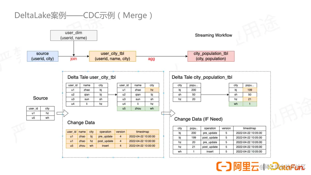 如图我们定义了一个数据源和三张表。user_dim 是一张维表,user_city_tbl 表示用户所在地,city_population_tbl 用来统计城市常驻人口。user_city_tbl 表的更新需要 source 源和 user_dim 表做 join 后写入。city_population_tbl 表是通过对 city 字段做聚合产生的。现在让我们将两张表都开启 CDF,看一下会有什么数据产生。比如当前在上游来了两条数据,user1 来自杭州,user5 来自武汉,通过 Merge 语句将数据加载到 user_city_tbl 中,如图,user1 已经存在所以会更新地址信息,user5 为新用户所以插入数据。对于更新操作会有两条数据来表示,一条是 pre_update,表示更新前的旧值,一条是 post_update,表示更新后的新值。对于新插入的数据我们只要一条数据来表示插入操作,没有旧值。对于删除操作,CDC 当前的值表示它的一个旧值,没有新值。