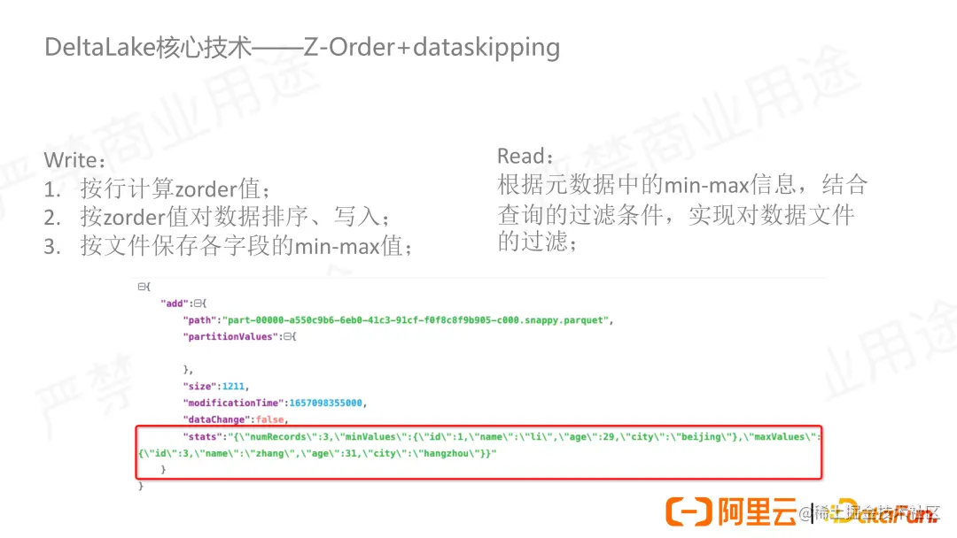 Z-Order 只是帮我们做了一个文件布局,我们要结合 data skipping 才能发挥它真正的效果。这两个在功能上是各司其职互不干扰的,它们没有任何的在功能上的耦合,但是它们却必须是需要相互辅助的。我们可以想象一下,如果没有 Z-Order 这样的拥有良好聚集效果的文件布局,单独 data skipping 是不能实现较好的文件过滤效果的,同样只有 Z-Order 没有 data skipping,其单纯的文件布局也起不到任何的读取加速的作用。具体的使用过程是:在写入时,完成对数据 Z-Order 排列,写入文件系统,并以文件粒度提取文件对应字段的 min-max 值,写入如图所示的 AddFile 的元数据 stats 中。在查询时,使用 min-max 值做过滤,选出符合查询条件的需要加载的文件,之后对数据再做过滤,从而减少文件和数据的读取。