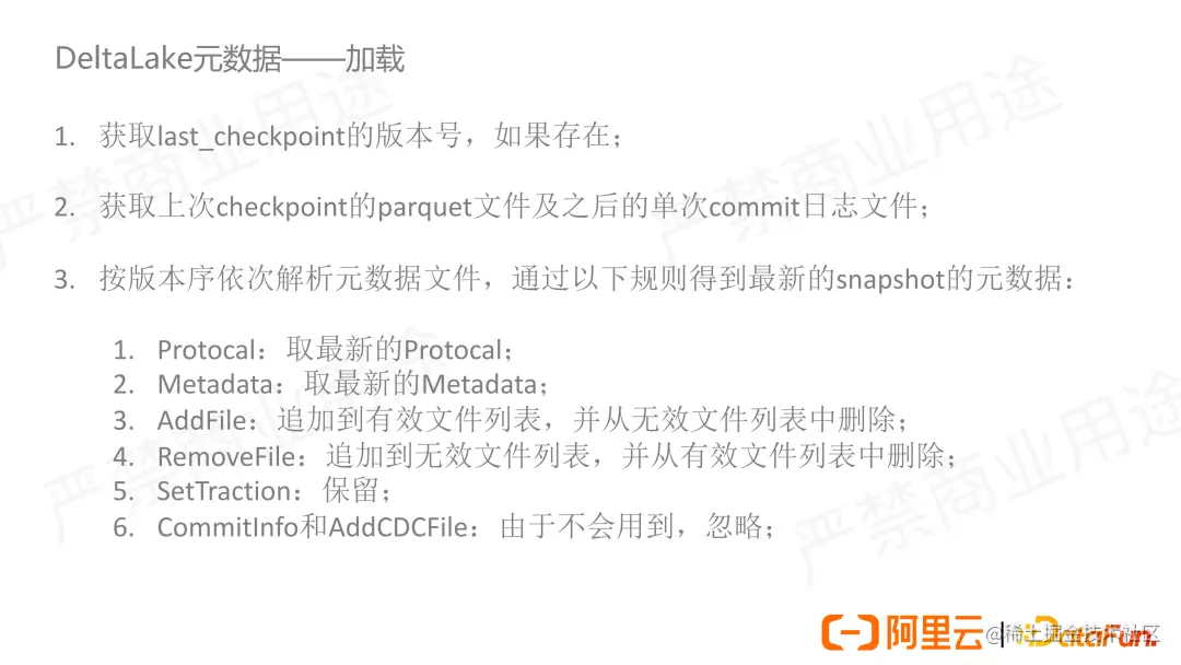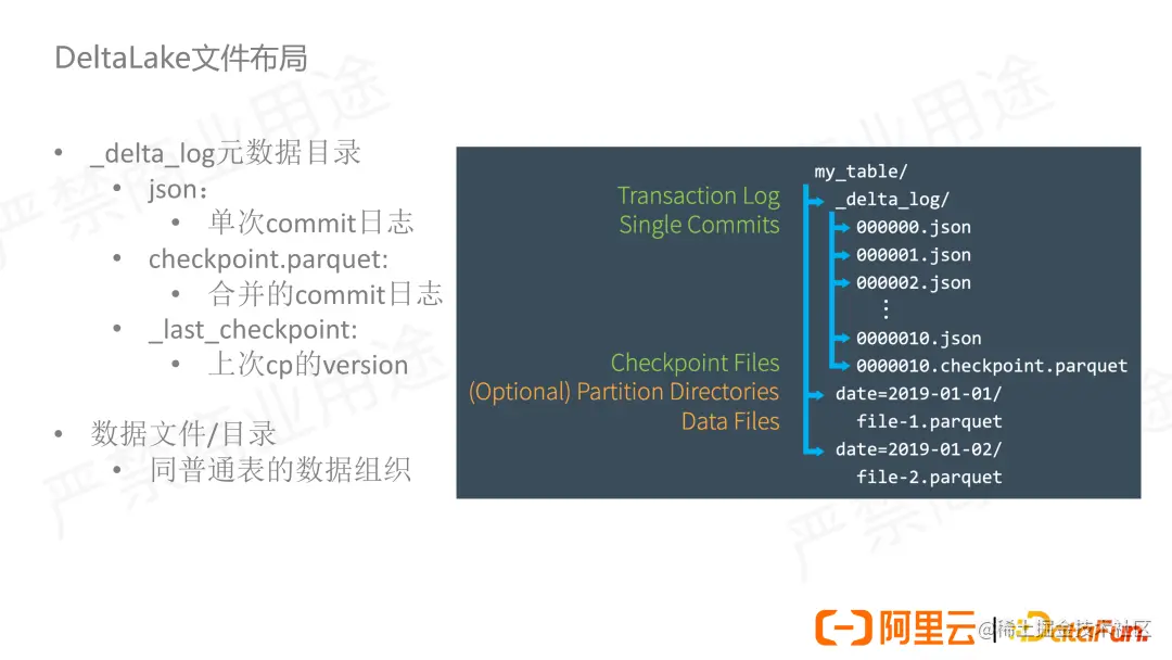 Delta Lake 的元数据由自身管理,不依赖于 Hive Metastore 这样的外部元数据存储。图中的介绍文字分为绿字和橙字两部分,下部橙色标识的是普通的数据或者目录文件,它和普通表没有什么区别,也是以分区的结构管理。区别在于上面元数据的部分,这部分有三类文件,第一类是 json 文件,它记录的是每次 commit 之后产生的信息,每次 commit 会生成一个新的 json 文件;第二类是 checkpoint.parquet,它是由前一次的 checkpoint 文件及其之后的 json 文件合并而来,它的作用是用于加速元数据解析;第三类是 _last_checkpoint 文件,它存储的是上次 checkpoint 的版本号,来快速定位到需要读取的 check point 文件,可以看到前两类文件是元数据的核心。