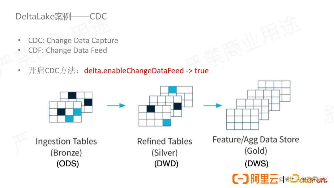 Change Data Capture(CDC, 变化数据捕捉)。最后让我们来讲一下 CDC 场景,这里涉及到 Delta 2.0 发布的非常重要的 CDF 特性。CDC 是一个用来捕捉和识别数据的变化,并将变化的数据交给下游来做进一步处理的场景。CDF 是一种能让表或者数据库能够具备吐出变化数据的能力。CDF 的输出结果可以标识出数据做了什么样的变化,比如 insert,update 或者 delete,以及可以让我们知道数据在变更前后的内容,CDF 同时也包含了版本数据变化的时间点和版本号信息。在 Delta Lake 中开启 CDF 只需将 delta.enableChangeDateFeed 设为 true。