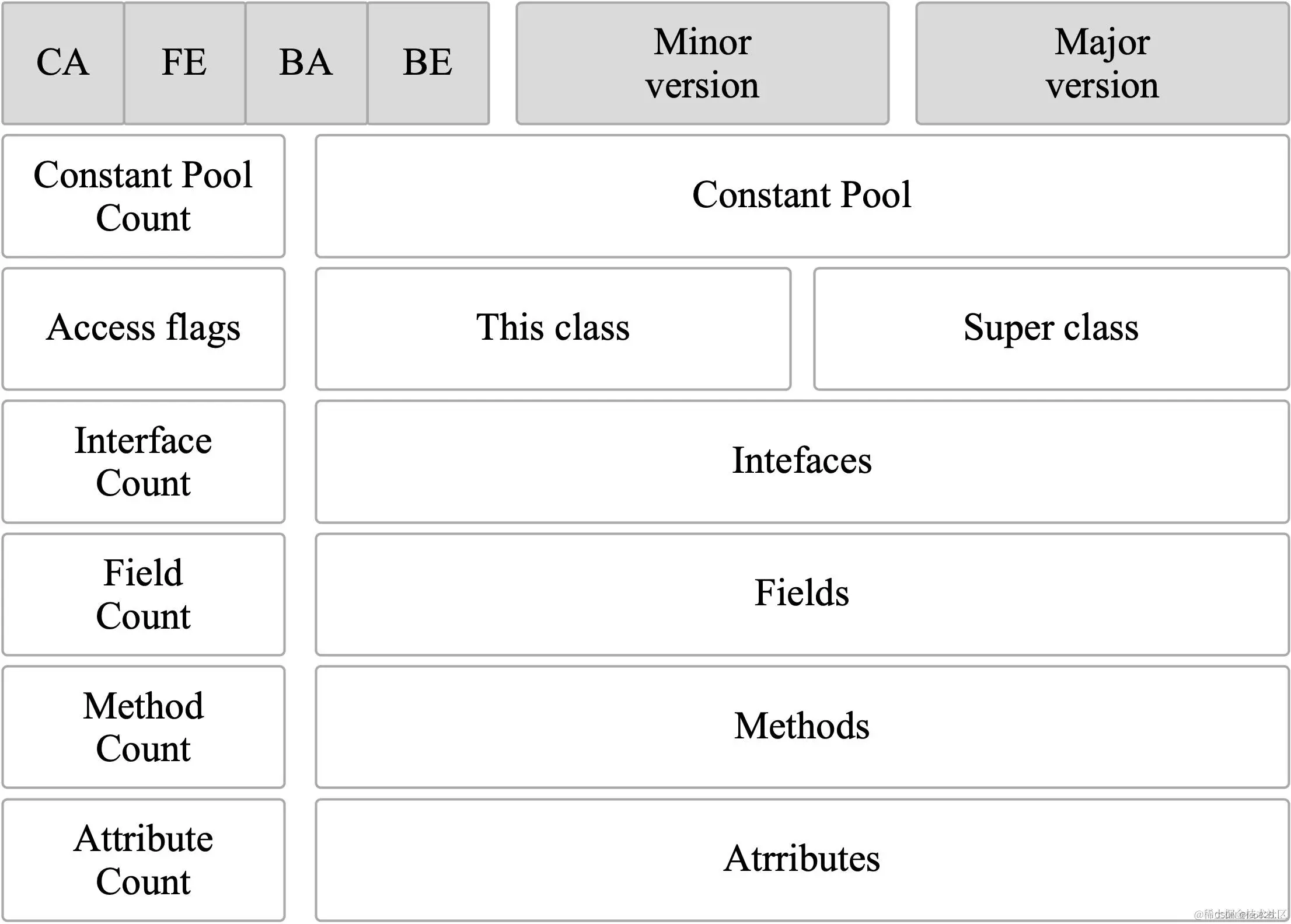 8位字节为基础单位的二进制流,各项数据无添加分隔符严格按照顺序紧凑排布在Class文件之中。 - 内部结构只包含两种数据结构:(view和ViewGroup理解)