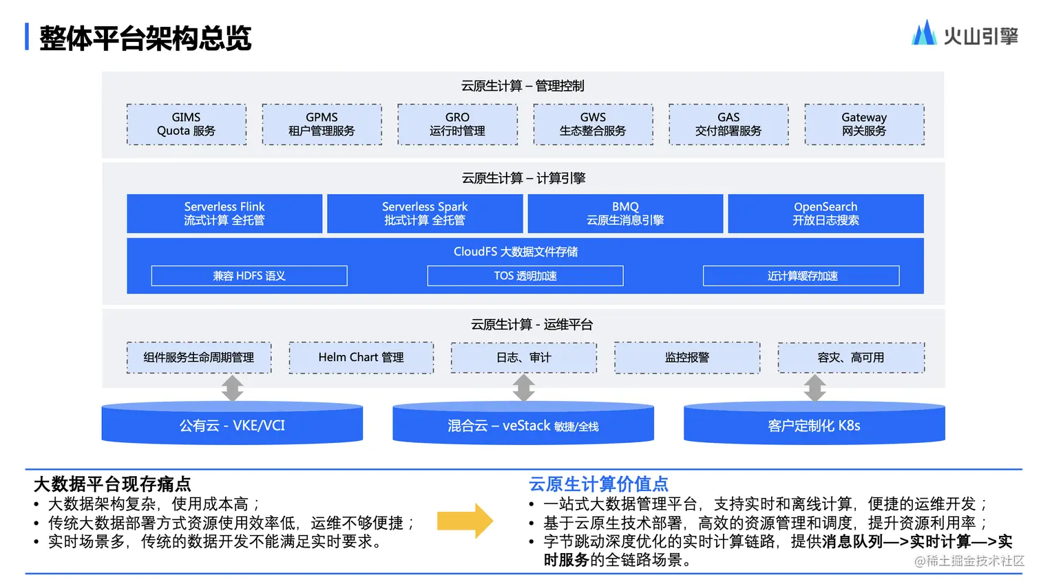 最下层是基础底座,支持火山引擎的云原生 公有云版本的 VKE/VCI,混合云版本和客户自有 K8S 的云原生环境,还支持多云管理和混合部署,提升计算链路使用过程中的资源利用效率。