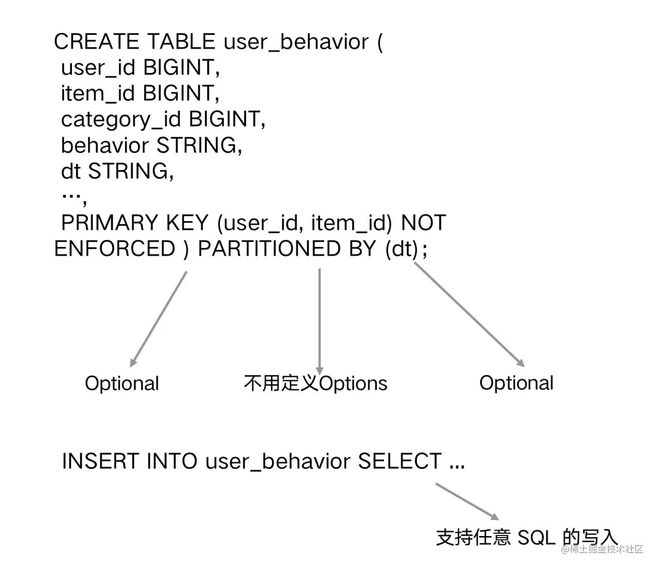 Flink Table Store 可以全面支持 Flink SQL。通过 Flink Table Store 存储后的数据,只要有这个业务逻辑,有主键可选,就能够进行任意的 DDL 定义,还支持所有的类型,如消息类型或 DML。在此基础上,我们就可以把查询或定义做得更好。