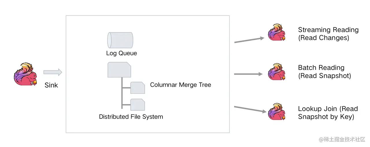两部分结合可以支持流读(Streaming Reading)、批读(Batch Reading)以及 L ookup J oin。