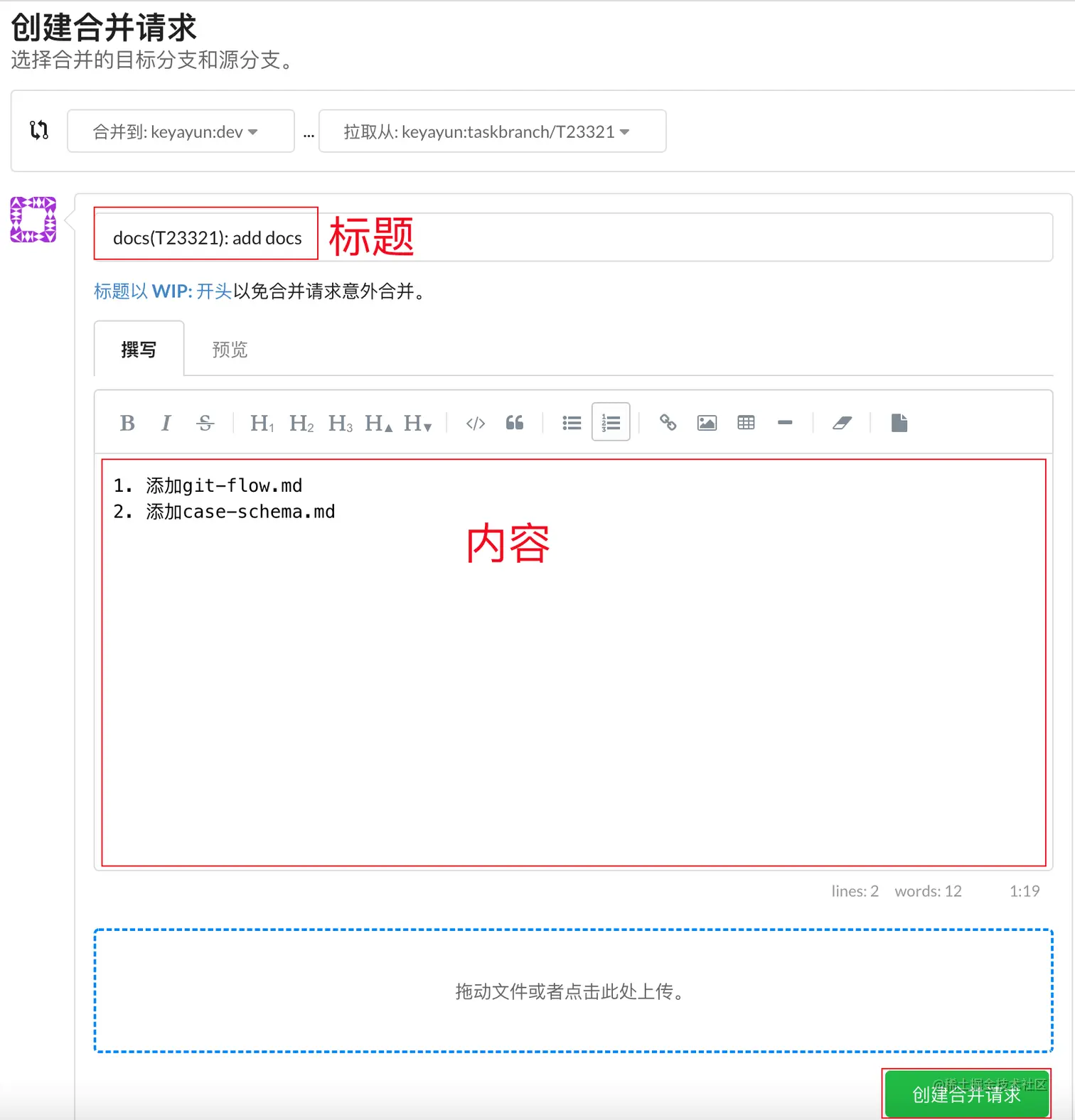 撰写 PR 标题和内容并点击创建合并请求