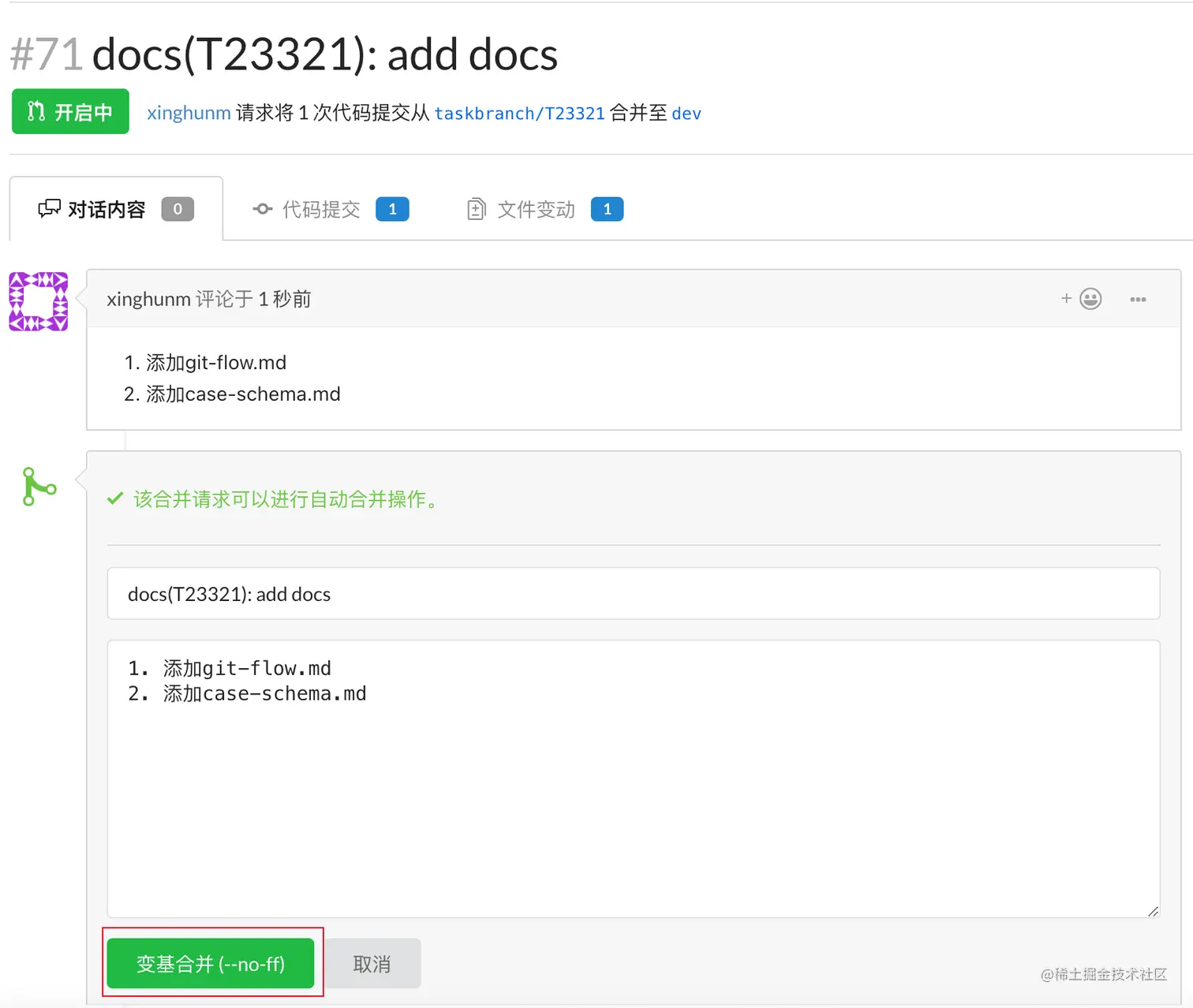 rebase 后就可以进行合并了,合并时应该使用--no-f的参数,该参数会将 task 分支所有提交合并到一起,与 dev 分支合并时产生一个新的提交,这能够保留 task 分支的提交信息,当出问题时更容易追溯是在做哪一个功能时导致的错误: