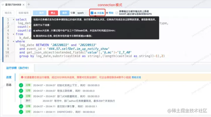 adhoc大任务和复杂的SQL会导致kyuubi engine在一定时间内性能下降,严重影响了其他正常的adhoc任务的执行效率。我们在adhoc前端开放了大查询模式,让这些复杂、查询量大的任务走kyuubi connection模式。在kyuubi connection模式下一个用户任务单独享有自己申请的资源,独立的Driver,任务的大小快慢都由自身的SQL特征决定,不会影响到其他用户的SQL任务,同时我们也会适当放开前面一些限制条件。