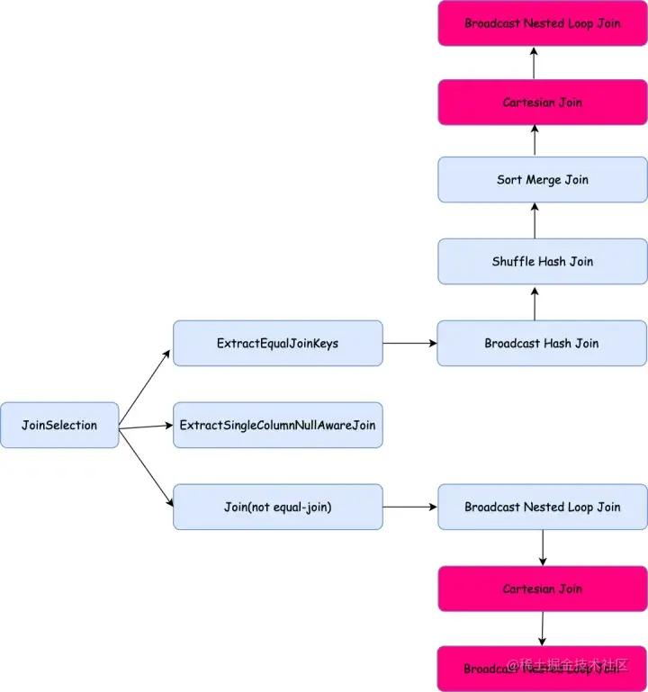 如果是非等值 join 则只能使用 BNLJ 或者 Cartesian Join,如果在第一次 BNLJ 时选不出 build side 说明两个表的大小都超过了broadcast阈值,则使用Cartesian Join,如果Join Type不是 InnerType 则只能使用 BNLJ,因此Join策略中选择Cartesian Join和第二次选择 BNLJ 时为危险 join。