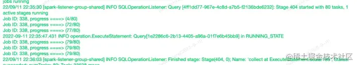任务在执行过程中,用户最关心的就是自己任务的进度以及健康状况,平台比较关心的是任务所消耗的计算资源成本。我们在Engine端,基于事件采集user、session、job、stage信息并进行存储,启动定时任务将收集的user、session、job、stage信息进行关联并进行资源消耗成本计算,并将结果注入对应operation log中, 回传给前端日志展示。