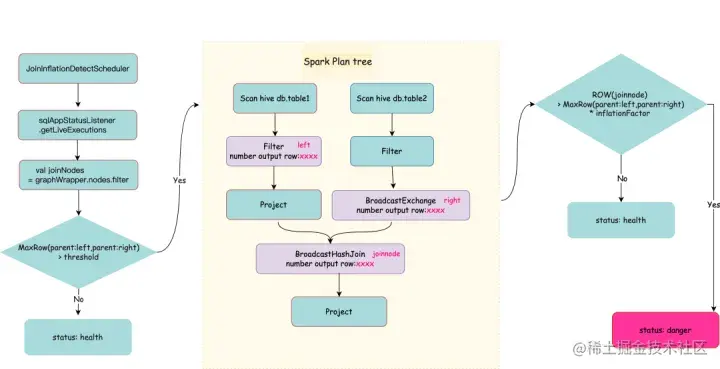 在shareState 中的 statusScheduler 用于收集 Execution 的状态和指标,这其中的指标就是按照 nodes 汇总了各个 task 汇报上来的 metrics,我们启动了一个 join检测的线程定时的监控 Join 节点的 "number of output rows"及Join 的2个父节点的 "number of output rows" 算出该 Join 节点的膨胀率。