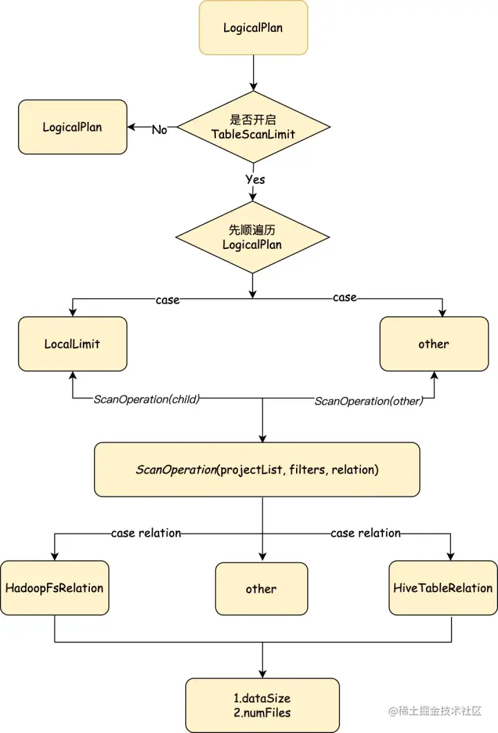 为保障kyuubi的稳定性,我们对查询数据量过大的SQL进行限制。通过自定义外部optimization rule(TableScanLimit)来达到目的。TableScanLimit匹配LocalLimit,收集子节点project、filter。匹配叶子结点HiveTableRelation和HadoopFsRelation。即匹配Hive表和DataSource表的Logical relation,针对不同的表采取不同的计算方式。