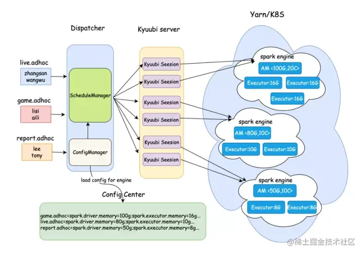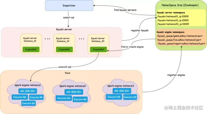 用户信息和队列的映射由上层工具平台统一配置和管理,Kyuubi只需关心上游Dispatcher提交过来user和queue信息,进行调度并分发到对应队列的spark engine上进行计算。目前我们有20+个adhoc队列,每个队列都对应一个或者多个Engine实例(Engine pool)。