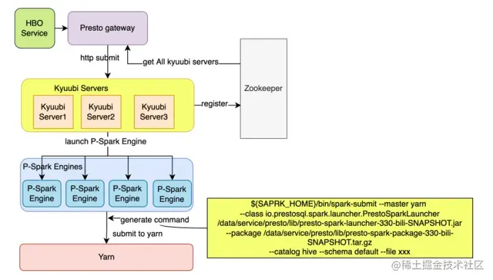 为了让用户无感知的执行presto on spark查询,我们在presto gateway上做了一些改造,同时借助kyuubi restulful的接口,和service + engine的调度能力,在kyuubi内开发了Presto-Spark Engine,该engine能够比较友好的来提交查询到Yarn。