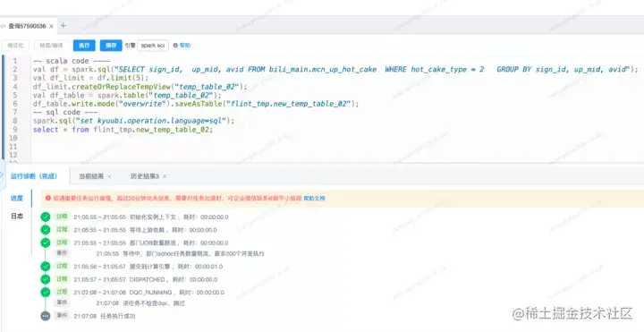 目前在Adhoc查询场景下,SparkSQL占比接近一半,依赖Kyuubi对于Scala语法的支持,目前已经有部分高级用户使用scala语法提交语句执行,并且可以在SQL和Scala模式做自由切换,这大大丰富了adhoc的使用场景。