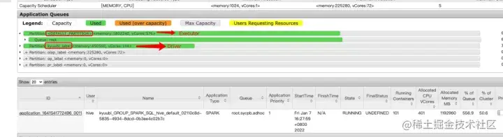 而在kyuubi_lable的同队列下则能够成功运行, 这样我们既借助了yarn的资源管控能力,又保证了kyuubi driver获得的资源量。