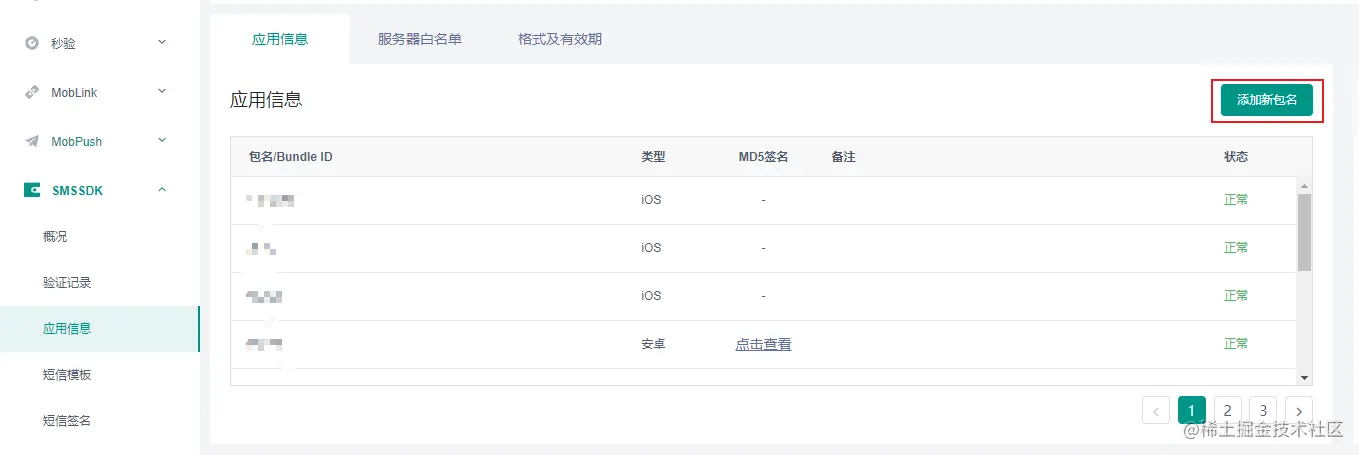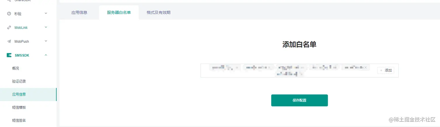 使用短信API接口时,需要在Mob开发者后台应用中添加对应服务器的IP,否则功能无法正常使用(可配置多个IP地址)
