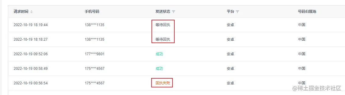 **注:**1.查询手机号时需要使用脱敏手机号;2.”发送状态“显示“等待回执”、“回执失败”,不表示发送失败:运营商给出的回执不是实时的,所以下发成功也可能出现“回执失败”、“等待回执”;