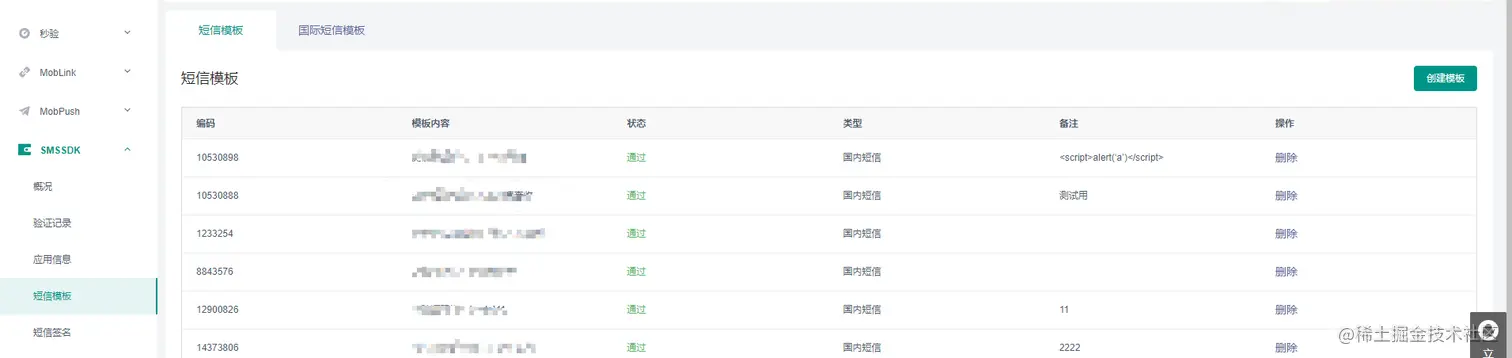 可在Mob开发者后台应用中根据业务需求创建多个不同的短信模板
