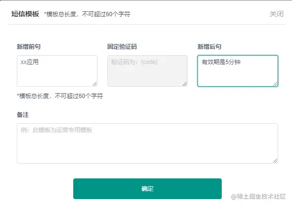 **注:**模板总长度不可超过60个字符,超过60个字符后收费会增加